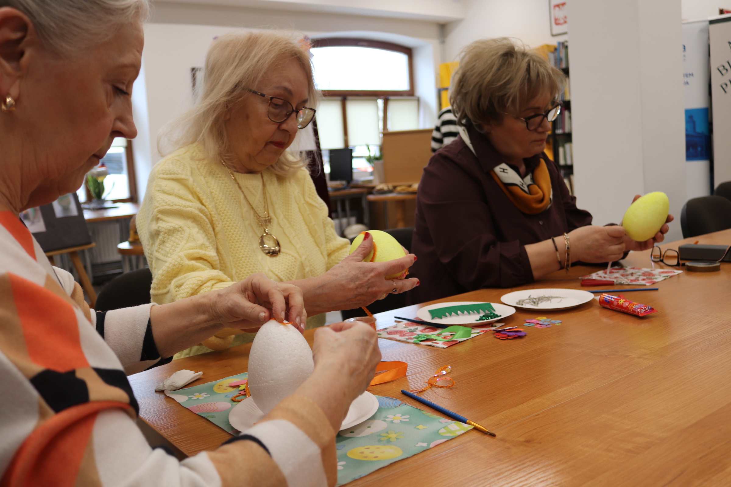 Uczestnicy własnoręcznie ozdabiali styropianowe pisanki wykorzystując w pracy materiały przygotowane przez bibliotekę. Kolorowe wstążki, cekiny, koronki, koraliki, kwiatki, pompony pobudzały kreatywność i przyczyniły się do powstania niepowtarzalnych prac. Dużą pomocą był kącik inspiracji mający na celu pobudzenie wyobraźni i dostarczający pomysłów na dekoracje a także wystawa książek o tej tematyce.